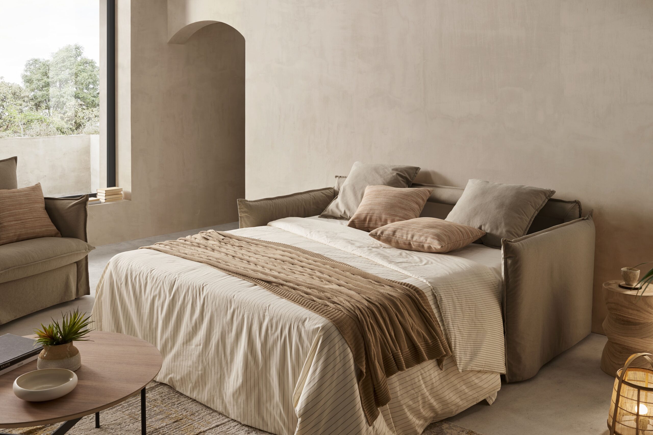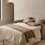 Sofá cama con colchón disponible en medidas de 140×200 y 160×200 cm, con un grosor de 18 cm. Garantía del mecanismo: 5 años.
