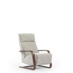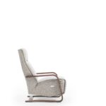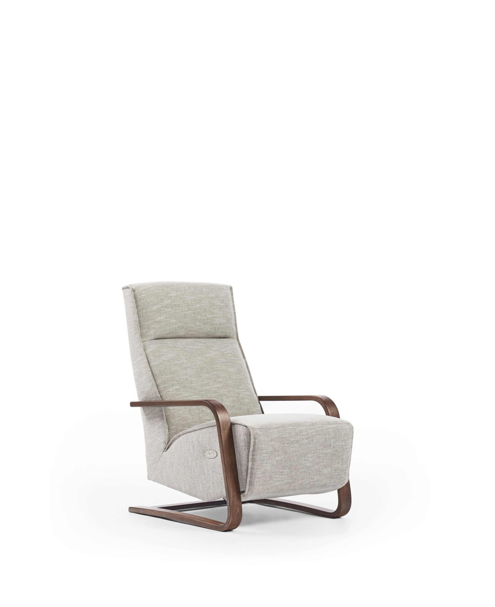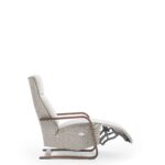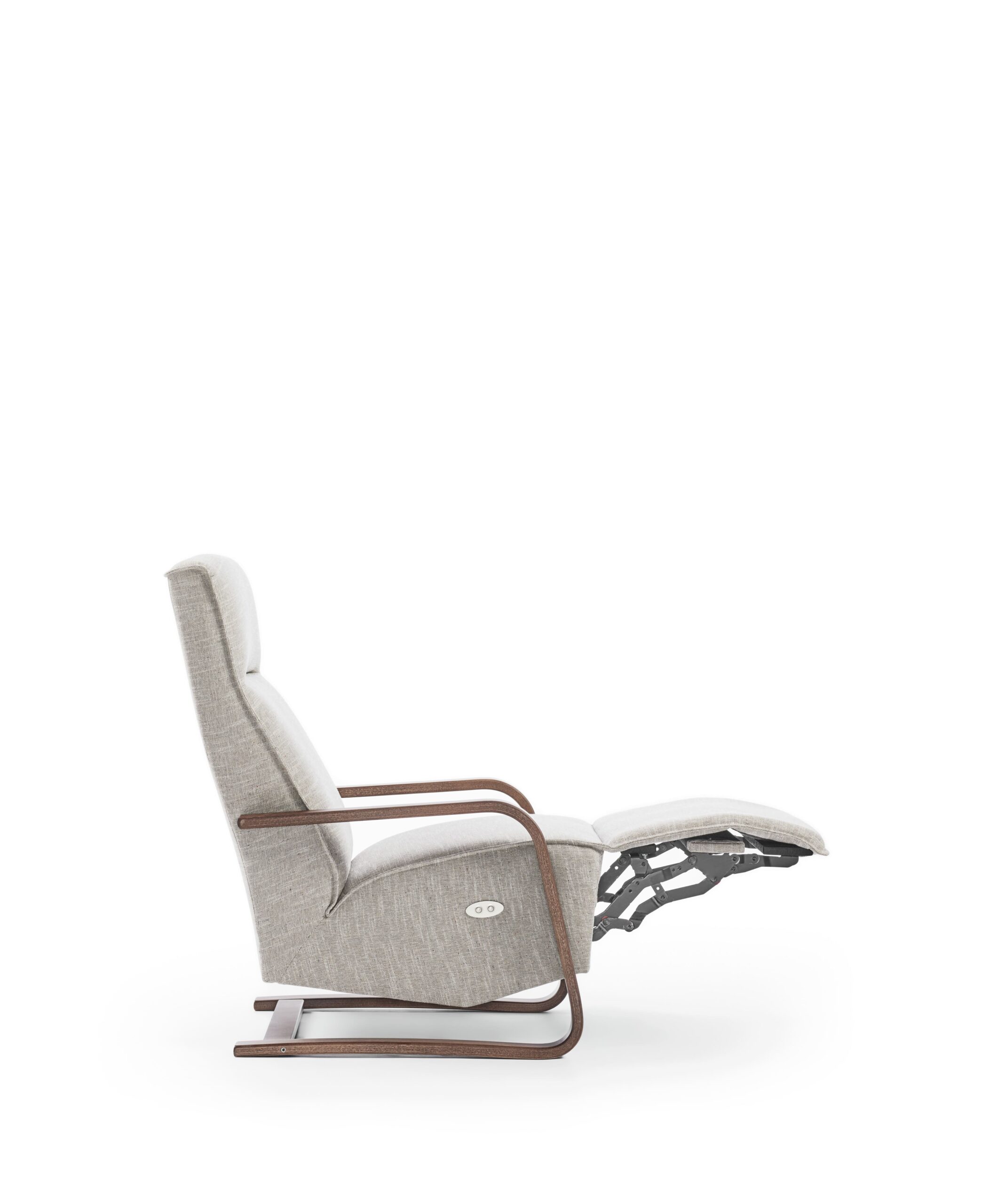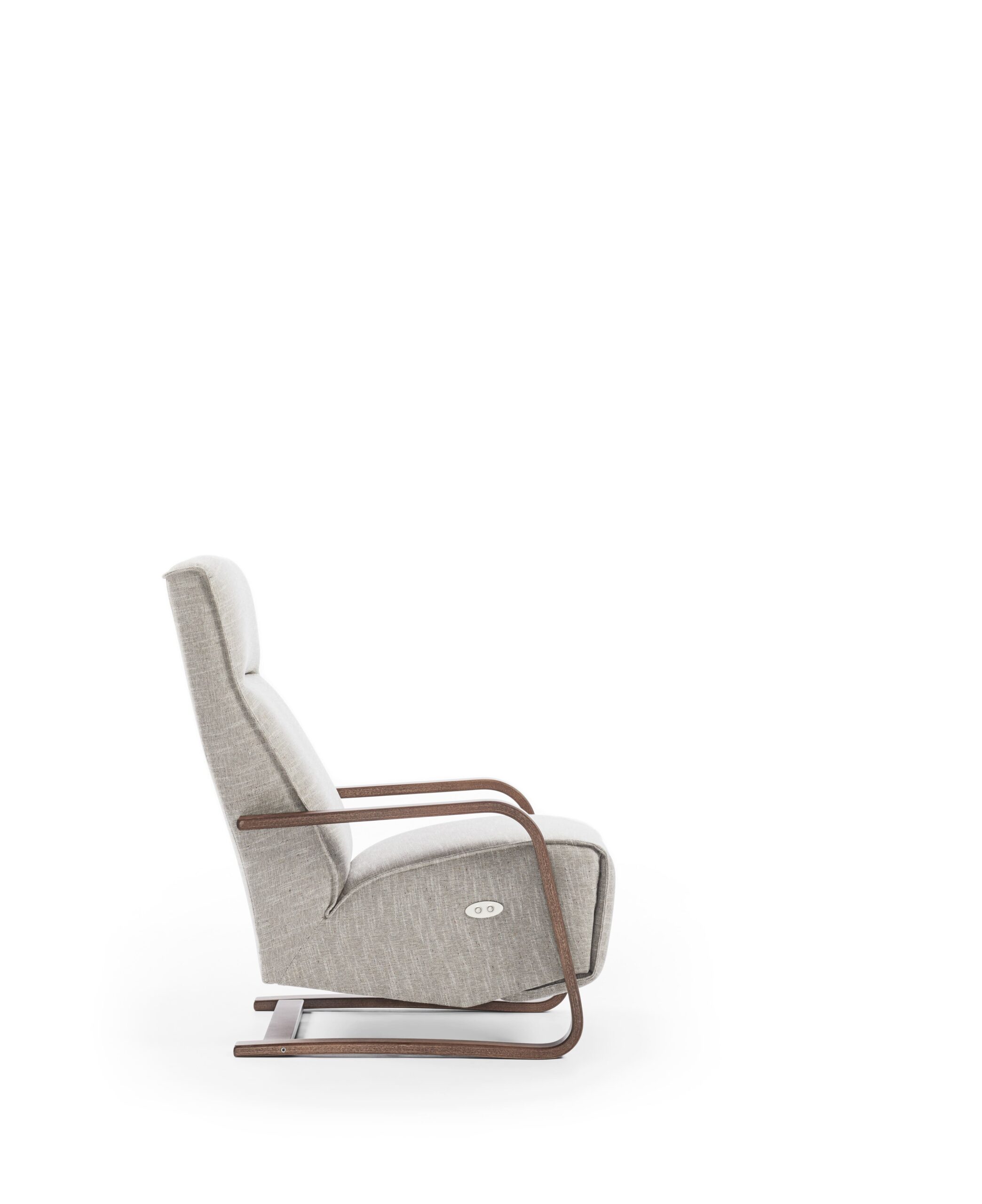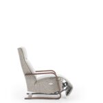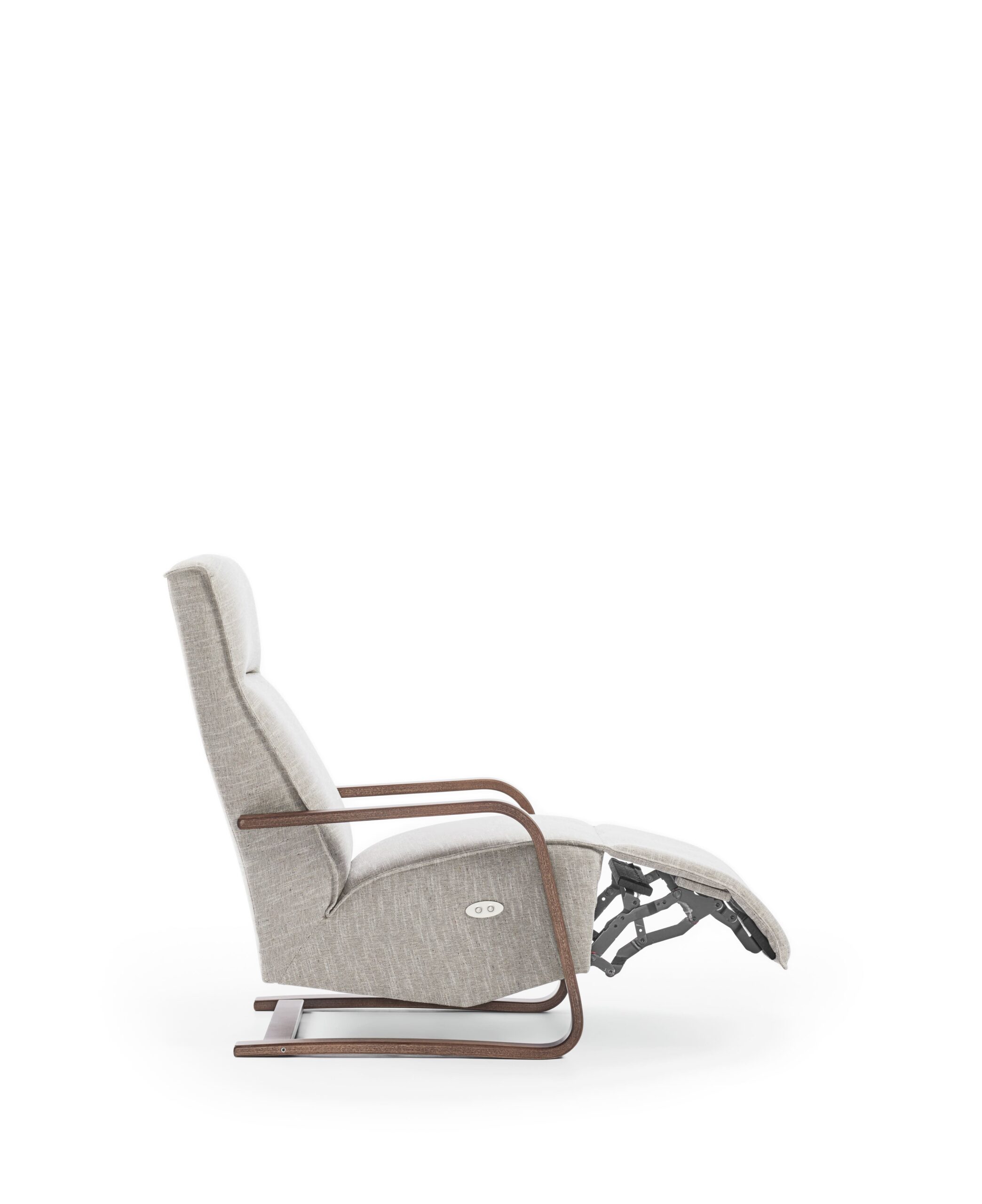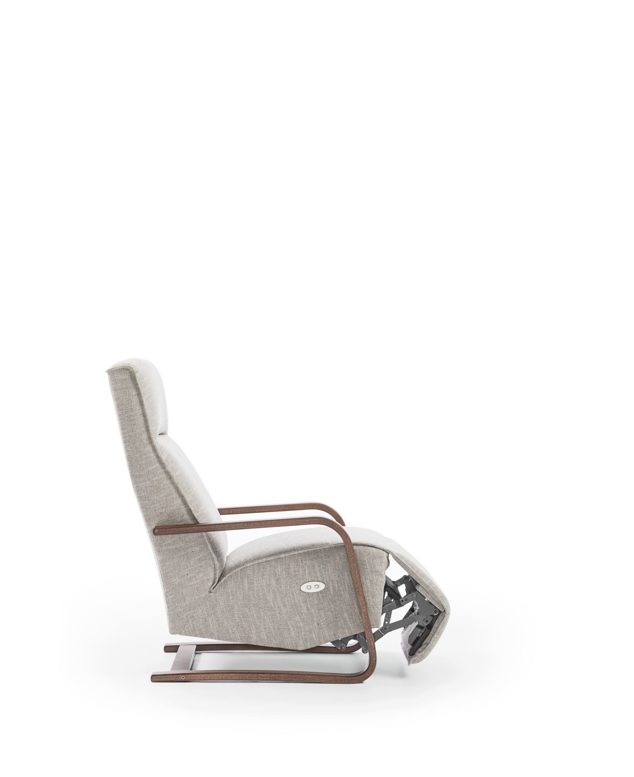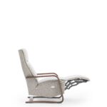 Peculiar butaca de ballesta con reposapiés eléctrico. Ofrece una suave sensación de balanceo al sentarse, que se complementa con un funcional reposapiés extensible mediante motor eléctrico.